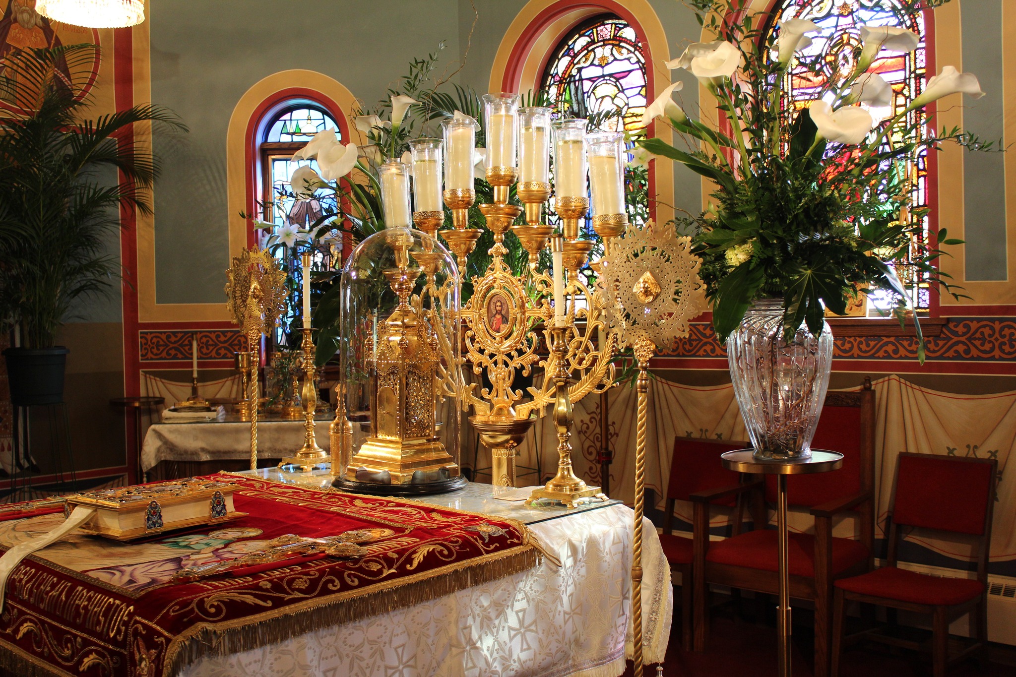Therefore, upon this Throne, our Lord symbolically “rests” in the form of the Book of Gospels – the word of the “Word” or Logos. It is also the place where the Tabernacle is kept, which contains the reserve sacrament (Holy Communion) for when the priest needs to administer them in various situations or emergencies. Thus, in both instances, “God” resides upon His Throne of Glory.